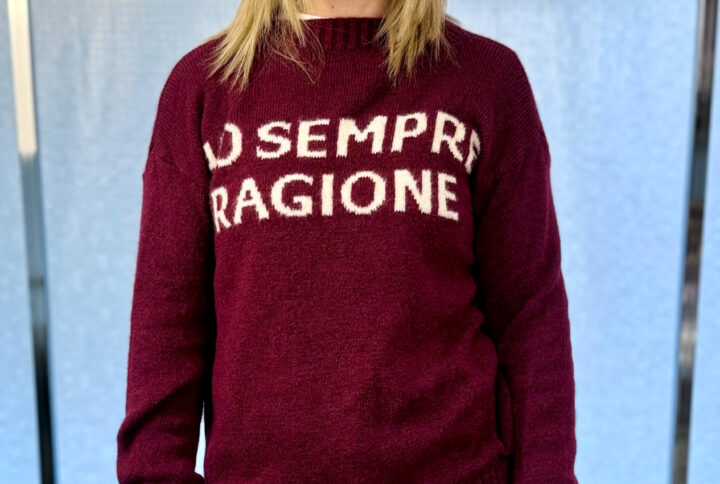A rendere unico il design sono le frange decorative sul fondo, che aggiungono movimento e un tocco boho-chic. Completano lo stile alcuni inserti luminosi discreti integrati nella lavorazione, che catturano delicatamente la luce e donano profondità al colore, rendendo il maglione adatto anche a contesti serali informali.