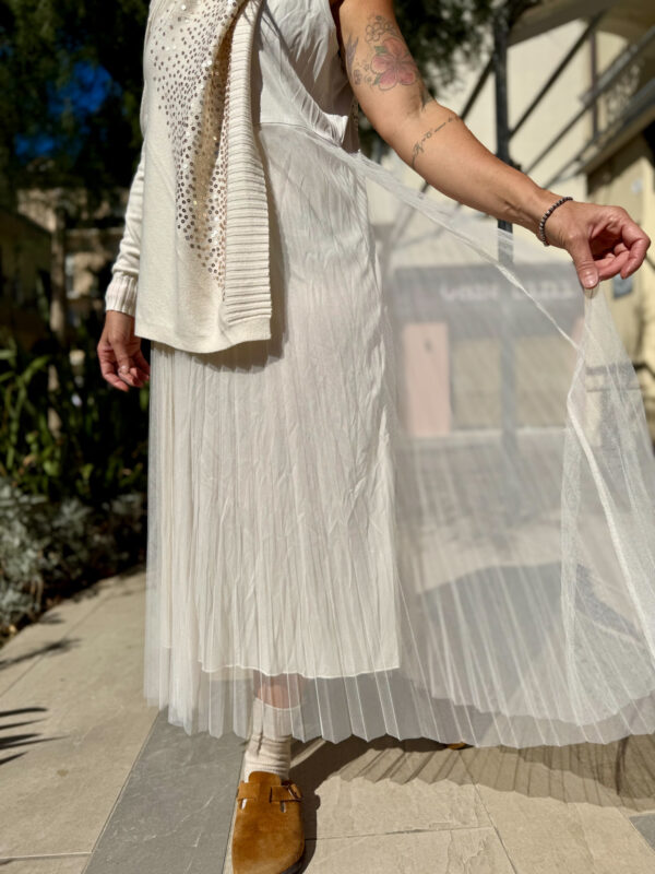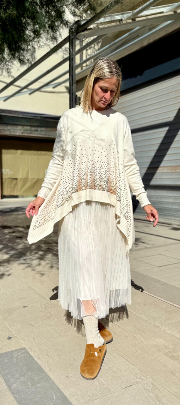 50,00 €L’ abito maglione in viscosa e paillettes abbinato al suo abito sottostante con spalla larga e gonna in voile è perfetto per un look elegante… -